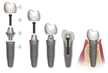 Time is allowed for bone to heal and grow around the dental implant in a process called osseointegration. The bone bonds with the titanium, creating a strong foundation for artificial teeth. A support post (or abutment) is then placed on the implant, and a new replacement tooth (or crown) is placed on top of the abutment.